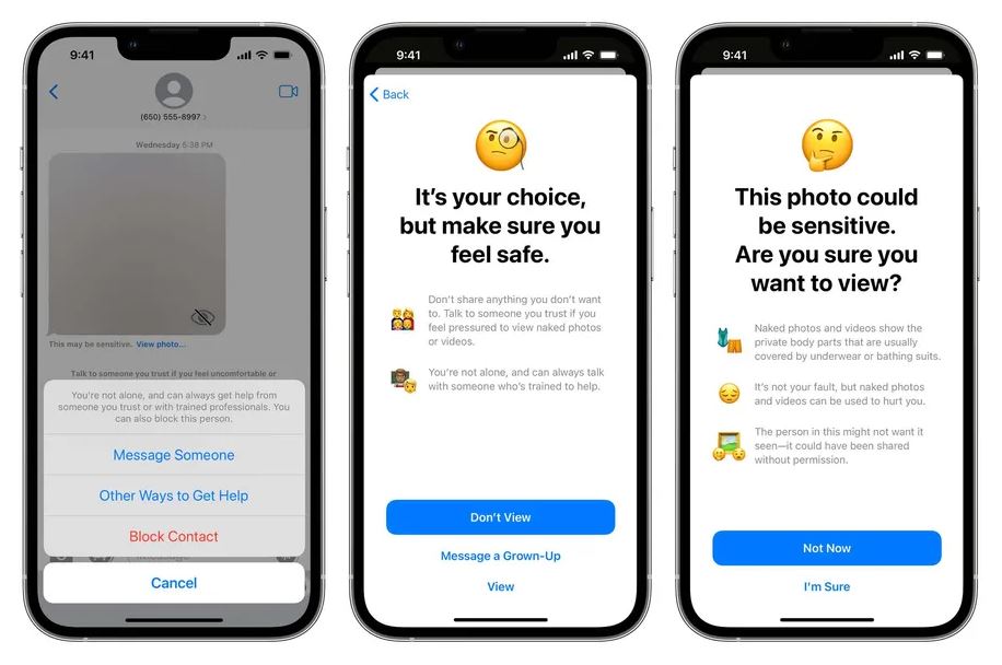 Skeniranje slika u potrazi za neprimjerenim sadržajem se događa na uređaju i ne utječe na enkripciju poruka. Značajka skenira dolazne i odlazne slike u potrazi za seksualno eksplicitnim materijalom kako bi zaštitila djecu. Ako se takav sadržaj ipak pronađe na slici, slika je zamagljena i daju se smjernice za pronalaženje pomoći i ohrabrenje u smislu da je uredu ne pogledati sliku i napustiti razgovor.